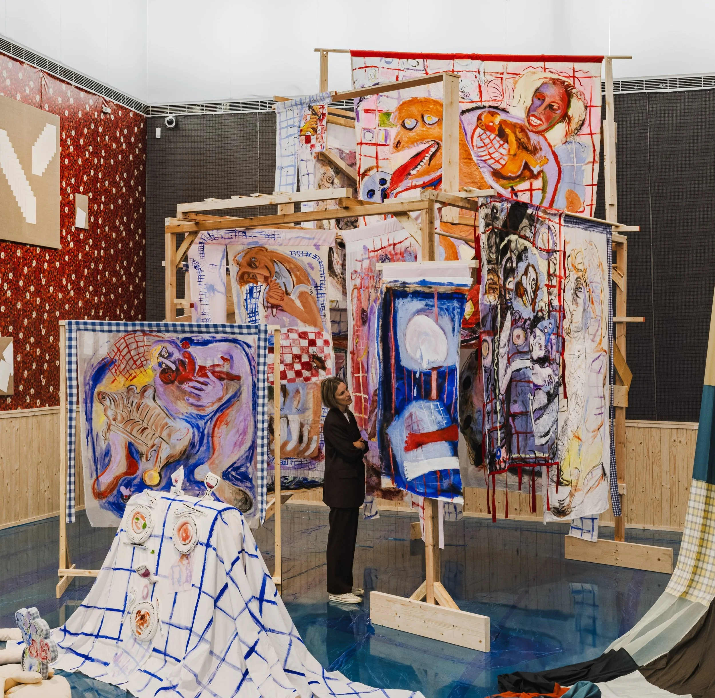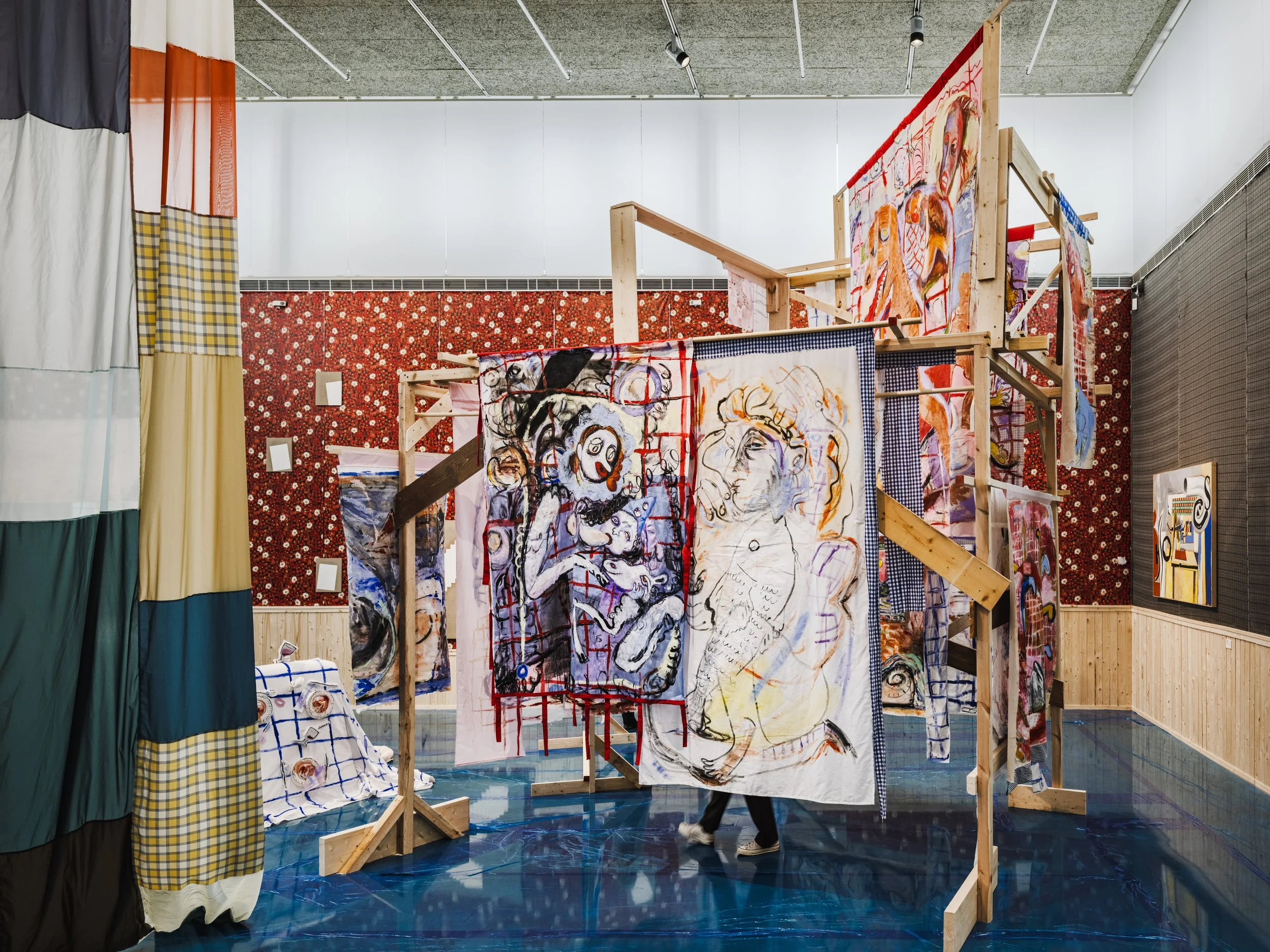 In the background: Curtains (2023–ongoing). Dimensions variable. Acrylic, oil, ink, crayon, textiles, (household/inherited) kitchen towels, wedding tablecloths, and bed sheets